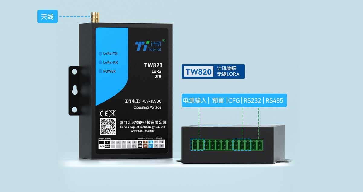 TW820 LORA DTU,低功耗远距离无线传输,高稳定性工业无线数传模块,loRa、10k米、低功耗、点对点、AES加密,数据广播、数据监听、定点传输、主从模式、自动中继、定点唤醒等功能。