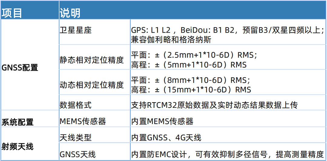 动态相对定位精度:平面±(8mm+1*10-6D)RMS;高程±(15mm+1*10-6D)RMS,精准定位监测。