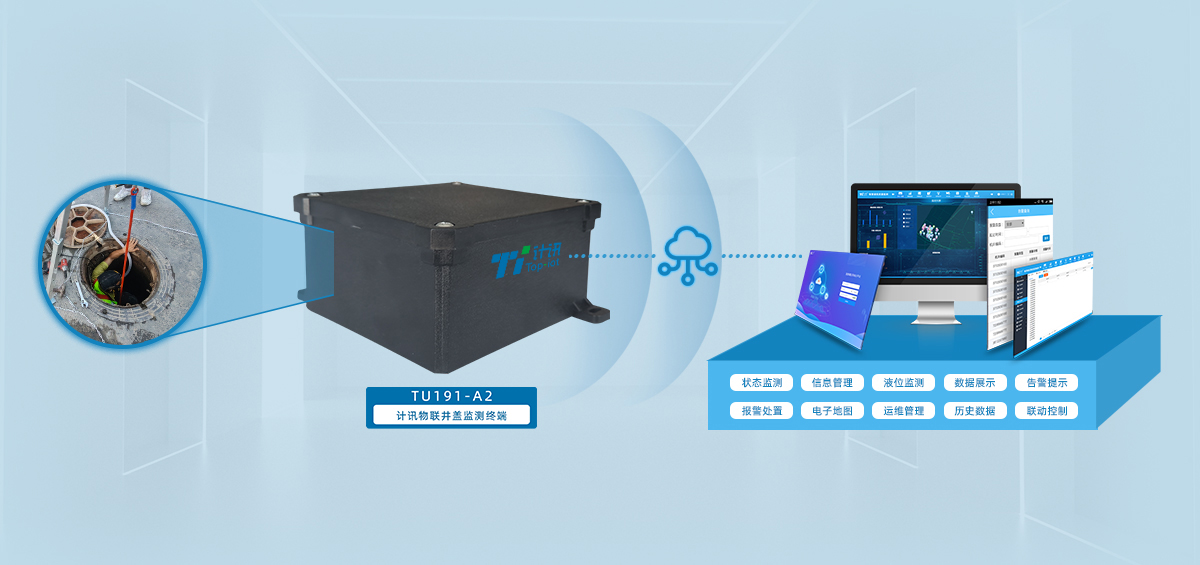 井盖监测终端TU191-A2支持数据采集与无线上云,并通过井盖监测管理系统实现井盖异动(移动、倾斜),井盖低电、液位超限等状态监测,井盖自动找平,数据异常及时定位告警,工作人员电脑端、手机端多方式第一时间接收异常设备信息进行检修维护,避免造成人身安全隐患及财产损失。