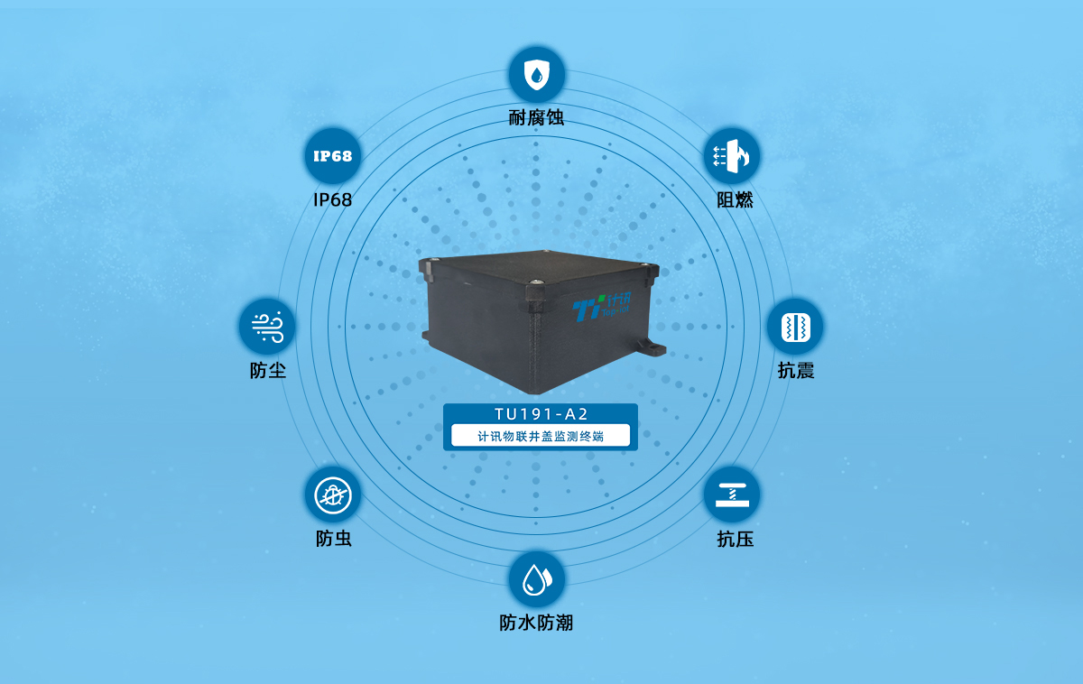 井盖监测终端TU191-A2,4G CAT.1稳定通信,低功耗设计超常待机,IP68高防护等级适用于雨水潮湿恶劣环境,支持井盖移动、倾斜、液位、气体监测,支持告警报警功能,电子标签分散设备远程统一管理,常用于城市供水井盖、供暖井盖、污水处理井盖、消防井盖等场景。