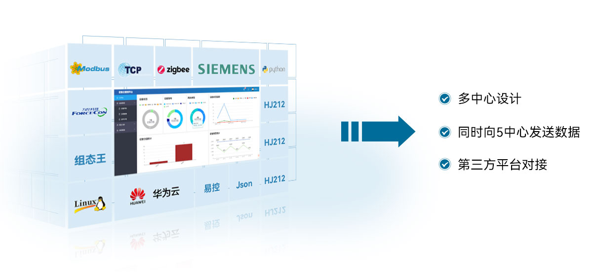 支持包括阿里云/华为云等主流云平台接入;支持modbus rtu、modbus tcp、mqtt、http、json等协议,强协议转换能力实现系统和设备间数据交换和互通。