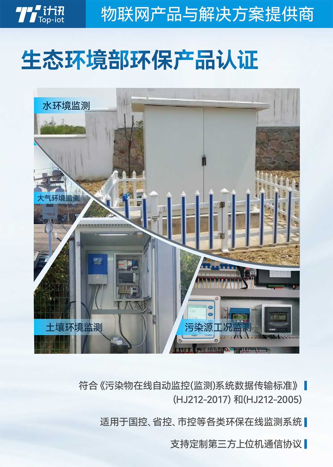 TS910系列环保监测终端,丰富接口及协议,下行前端数据自动采集、主动上云,上行对接环保监管部门、 智慧环保平台、第三方定制平台,实现水、气、噪声等环保监测、污染源工况的远