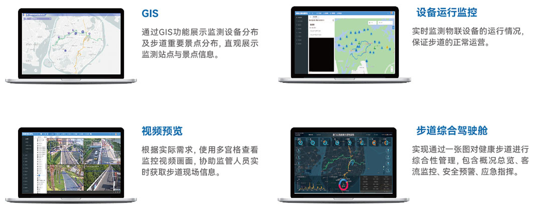 健康步道平台应运而生,其依托物联网、大数据、云计算和人工智能等技术,步道健康状态、设备管理、能耗管理、环境监测、人流安全管理等,多角度健康步道全方位综合