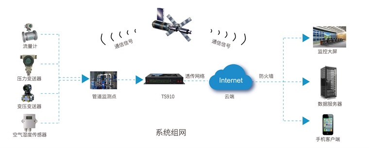 2.无线数据通讯:无线数据通讯部分通过 TS910数采仪使用3G/4G的无线传输方式将数据通过因特网传输到目的中心。使用无线数据传输的方式能节省很大的人力物力,做到便捷部署与维护简便。