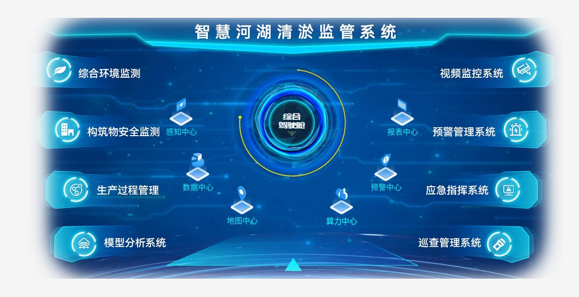 系统包括:综合环境监测分析平台、安全作业监管平台、生产过程智能管理平台以及其它扩展子系统。对河湖的水质、水雨情、流量、形变量、位移量、噪音、恶臭、气象环境等因子进行实时监测,当因子数值超出预警阈值时,及时生成并发送预警信息到平台,实现对河湖清淤的全过程监管。